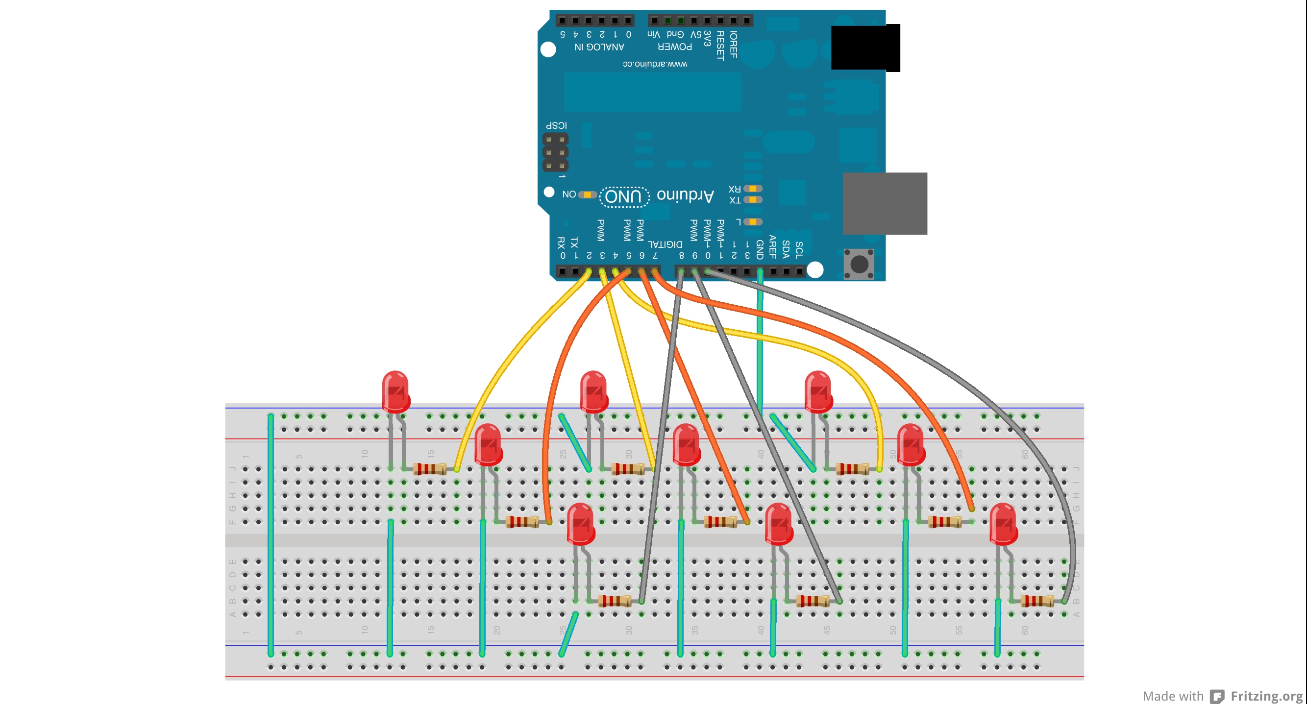 The trick here is to have 9 LEDs connected to pins 2 through 10. You need a 220 Ohm resistor for each LED so it can get a little packed on the Arduino headers.